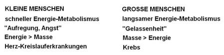 Interessanterweise haben große Menschen ein geringeres Risiko für Herz-Kreislauferkrankungen. Herz-Kreislauferkrankungen sind in vieler Hinsicht das Gegenteil der Krebs-Schrumpfungsbiopathie, nämlich eine „Stauungsbiopathie“. „Zu viel Energie für die zu kleine Masse.“