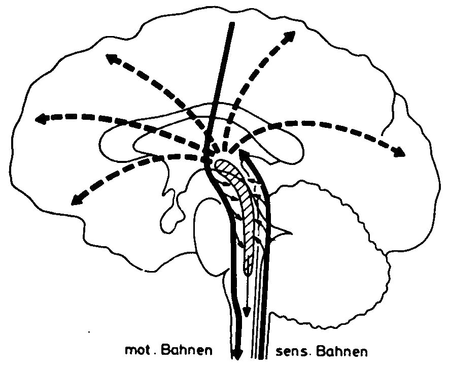 In unserer mechano-mystischen Kultur ist praktisch nur dieses senso-motorische System bekannt, das sich vom energetischen Orgonom ableitet. Die überwiegende Mehrzahl der Menschen haben gelernt, sich so zu empfinden. Man frage jemanden, er möge auf den Sitz seines Selbst, seines Ichs, seiner Seele, „auf den Kern seiner Existenz“ zeigen. Die wenigsten werden auf den Oberbauch deuten, die meisten auf den Kopf. Alles in unserer gegenwärtigen „Kultur“ ist darauf ausgerichtet, daß einem eine Gänsehaut den Rücken hochsteigt; Sensationen, die zu „action“, zu „Bewegung“ führen, entsprechend den motorischen Bahnen, die, gemäß der Fließrichtung des energetischen Orgonoms, von oben herab nach unten in die Extremitäten führen.
