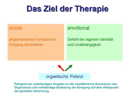 Demnach ist ein unneurotischer Mensch ein „orgastisch potenter“ Mensch und Psychotherapie sollte in erster Linie „Orgasmustherapie“ sein. Therapie soll dem Patienten die innere Fähigkeit zu einem befriedigenden Sexualleben geben.