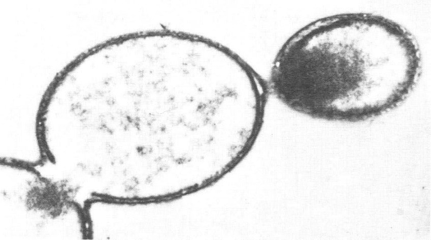 Wie die Grundeinheit des Lebens, die einzelne Zelle, entstanden ist, weiß man nicht, aber es ist interessant, daß sich mikroskopisch kleine kugelige Gebilde etwa von der Größe einfachster Bakterien abtrennen, wenn die unter Wärmeeinwirkung gebildeten proteinähnlichen Ketten in einer Lösung abgekühlt werden. Die aneinanderliegenden konzentrischen Kugeln vermitteln den Eindruck von Zellen, die sich teilen; [unten] läßt eine elektronenmikroskopische Aufnahme deutlich eine doppelte, umschließende Schicht erkennen, die an eine Zellmembran erinnert. Solche kugeligen Gebilde sind noch weit von der lebenden Zelle entfernt, aber sie lassen vermuten, daß manche ihrer Grundstrukturen sich unter bestimmten Umständen aus rein chemischen Reaktionen entwickelt haben könnten.
