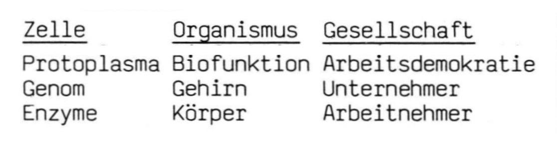 Nach Hass ist das Erbrezept die „eigentliche und zentrale Regierung im Körper“ und „das gesamte Zentralnervensystem eine Hilfseinheit, die ihr einen Teil der Steuerungsgeschäfte abnimmt.“ So können wir Hass Reichs Kritik des mechanistischen Konzepts vom Gehirn als „Direktor“ des Körpers entgegenhalten. Für Reich bildet nämlich der Organismus „ein natürliches Kooperativ gleichwertiger Organe verschiedener Funktion“, dies sei die biologische Begründung der Arbeitsdemokratie. Und eine wirklich konsequente Energontheorie müßte hier an sich konform gehen, wenn selbst Hass schreibt: