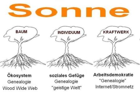 Offensichtlich ist es im Wald genauso wie in der menschlichen Gesellschaft. Die Bäume nehmen die Energie der Sonne auf und halten so das „Wood Wide Web“ aufrecht, das ich in Orgonometrie (Teil 2): 2.i. Die Verwurzelung des Denkens in der Natur erwähnt habe. Das Individuum erwirtschaftet einen Überschuß, kann essen (= Aufnahme von Sonnenenergie!), wohnen und sich fortpflanzen und setzt so das sich unendlich verzweigende genealogische Geflecht fort bzw. wird Teil von ihm. Genauso wird das Weltnetz von Kraftwerken gespeist, deren Energie sich größtenteils auf die Sonne (fossile Energien, erneuerbare Energien) zurückführen läßt. (Hinzu kommen Energien, die ebenfalls „kosmischen“ Ursprungs sind, d.h. auf die Bildung des Sonnensystems zurückgehen: Kernkraft, Erdwärme, Gezeiten.)