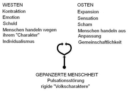 Gegenwärtig sieht es so aus, als würde im Westen der Mensch zunehmend von seinen Sensationen bestimmt werden, während es im Osten umgekehrt immer mehr die Emotionen sind. Aber dies ist kein Weg zu einer „Harmonisierung“, sondern ganz im Gegenteil wird die ohnehin gestörte bioenergetische Pulsation nur noch mehr durcheinandergebracht. Es ist ungefähr so, als würde man einem Amphetaminjunkie Beruhigungsmittel geben. Statt eines energetischen Ausgleichs kommt es zu einem endgültigen Zusammenbruch der Pulsation. Wir haben dann den ständig egoistisch „Solidarität“ einfordernden „Ossi“ und den oben erwähnten heutigen Rotchinesen vor uns, den sowohl die übrigen Asiaten als auch die Westler einfach nur entsetzlich finden.