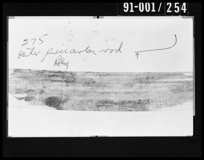 The tear to the tie was described by the FBI laboratory as a „small elongated nick“ on the „left side of the knot of the tie“ (CD 205, p.154; 5 H 62, WCT Robert A. Frazier; 7 HSCA 89).