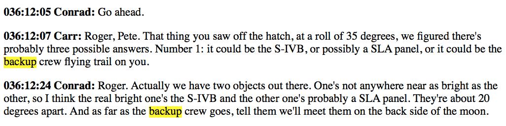 Der UFO-Historiker Richard Dolan soll an eine Audio-Aufnahme des Funkverkehrs von Apollo 12 gekommen sein, in der von einer „Backup Crew“ die Rede ist: