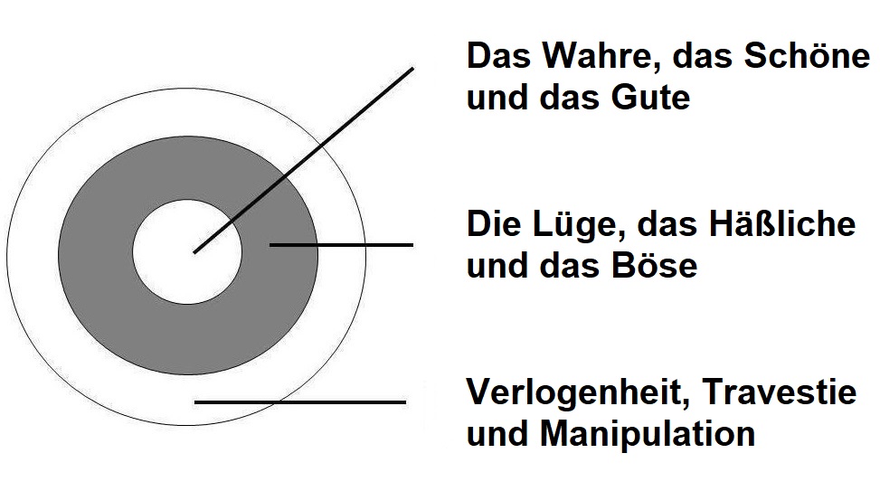 Aber ist die Wahrheit nicht häßlich und „böse“, wie hier das Runtermachen einer „Schönheitskönigin“? Das ist eine Frage, die einem abstrakten, bioenergetisch unfundiertem „Denken“ entstammt. Philosophie! Wenn die Lüge, das Häßliche und das Böse bloßgestellt werden, dann ist das eine Funktion des bioenergetischen Kerns. Die sekundäre Schicht und die Fassade leben davon, existieren überhaupt, weil kein Unterschied zwischen den drei Schichten gemacht wird: