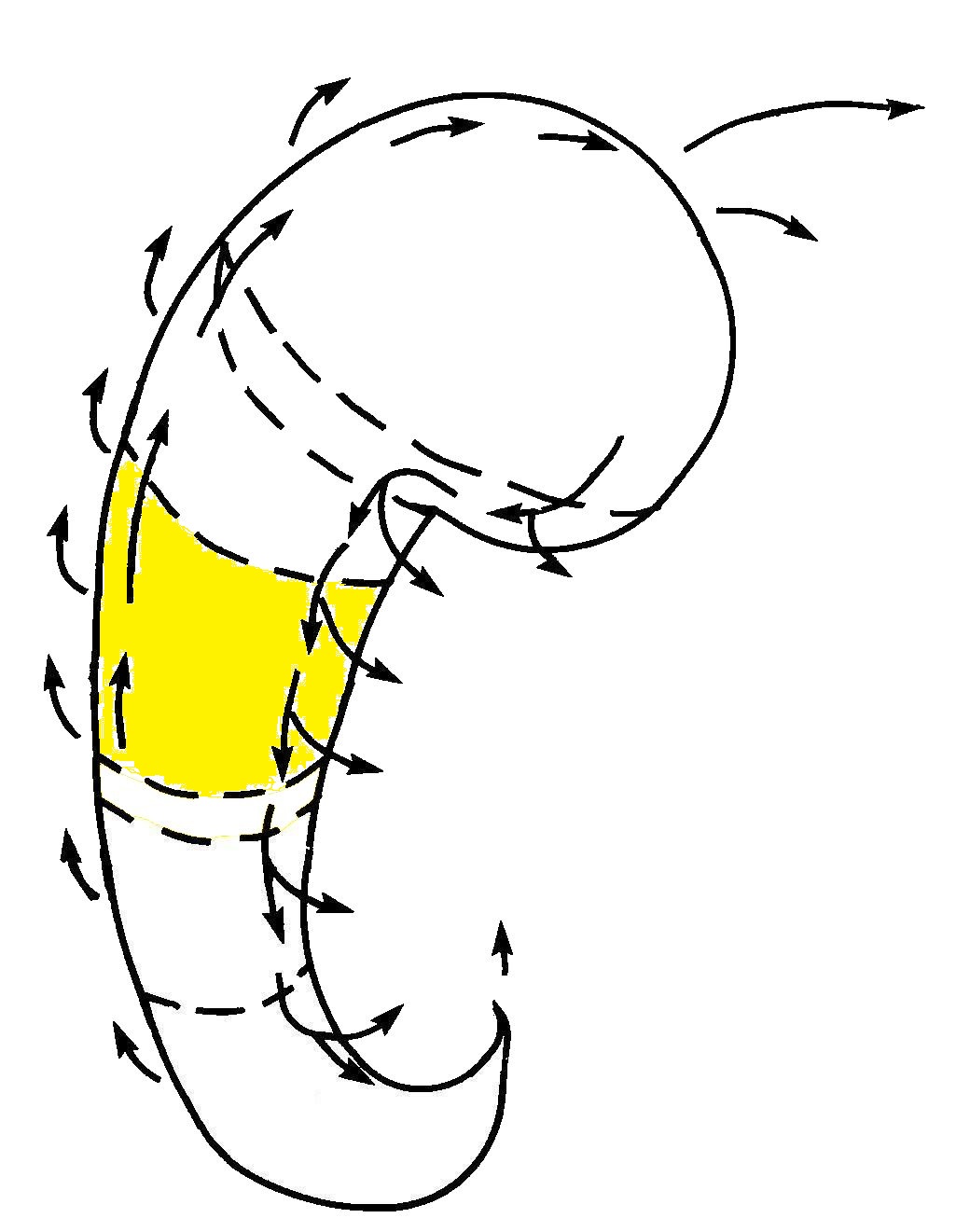 Zunächst einmal versuchen im Orgasmusreflex sich das Becken und der nach hinten geworfene Kopf einander zuckungsartig zu nähern, wobei die Brust kollabiert (Ausatmung), so als wolle sie sich in der Mitte zusammenfalten, was aus anatomische Gründen natürlich nicht geht. Daß Mund- und Bauchsegment zusammengehören, sollte offensichtlich sein, beginnt doch die Verdauung bereits im Mund. Bioenergetisch ist die „Magenverstimmung“ funktionell identisch mit der „depressiven Verstimmung“, die mit dem oralen Segment verbunden ist. Die Melancholie (chronische Depression) schlägt auf den Magen, während die Manie (manische Depression) mit Freßanfällen einhergeht. Hals und Zwerchfell sind die beiden Strukturen, die einerseits den Kopf vom Körper trennen (die meisten Menschen „leben“ nur in ihrem Kopf, „Sex findet im Kopf statt!“) andererseits den Unterkörper förmlich abriegeln. Mit Auflösung der Halspanzerung wird der Kopf frei bzw. verbindet sich der Kopf („der Geist“) mit dem Körper. Mit der entsprechenden Auflösung der Zwerchfellpanzerung wird der Körper erst als wirklich dreidimensional empfunden: ein Körper, durch den Ströme fließen. Am interessantesten ist aber die Verbindung von Augen- und Beckensegment: hier haben wir jeweils die innigste Verbindung zur Umwelt. An beiden Enden des Orgonoms drängt die Energie nach außen, wie an der obigen Abbildung zu sehen ist. Gehirn und Genital sind unmittelbar voneinander abhängig. Wie der Volksmund so schön kundtut, fickt der Gepanzerte mit dem Gehirn und „denkt mit dem Schwanz“. Nur der Ungepanzerte kann wirklich denken (d.h. funktionell denken) und wirklich lieben (d.h. wirklich Liebe empfinden – nicht nur „Platonisch“ bzw. pornographisch). Das zeigt sich in den Träumen und im Denken. Beides ist nicht mehr verwickelt, sondern eindeutig und einfach. Gleichfalls ist das Liebes- und Sexualleben nicht mehr „verwickelt“, d.h. voller Ambivalenz, sondern eindeutig und instinktsicher. Die „okulare Vision“ und die genitale Aktivität sind eins. Der Mensch ist mit sich und seiner Umwelt einig. ER LEBT! Für den Gepanzerten hingegen ist alles Wirrnis und Drama. Die Hysterie (Freuds „das Rätsel Weib“) ist das schlagende Beispiel, genauso aber auch der stets imgrunde saublöde Phallische Narzißt. Der verpeilte „Krieg der Geschlechter“…
