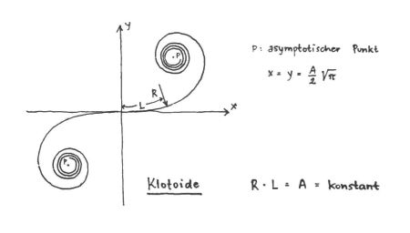 3) Im Zusammenhang mit den mathematischen Harmoniegesetzen die an den genannten geometrischen Figuren darstellbar sind, ist zu überlegen, ob die Projektion der Kreiselwelle auf die Grundrißebene des Hyperbeltrichters tatsächlich die harmonikale Spirale sein muß, sondern nicht vielmehr eine Klotoide. Dies ist eine Kurve, die wie der Kreis durch nur einen Parameter A bestimmt ist. Ihr Bildungsgesetz lautet dann R × L = A (s.a. Skizze). Denn nach einer Meldung in der sowjetischen Zeitschrift Biofisika XIX/2, S. 364f (1974) ergab die exakte Vermessung der spiraligen Struktur des Innenohrs (wo die Sinneszellen liegen) des Menschen und einiger Säugetiere, daß diese allesamt die Form der Klotoide haben.