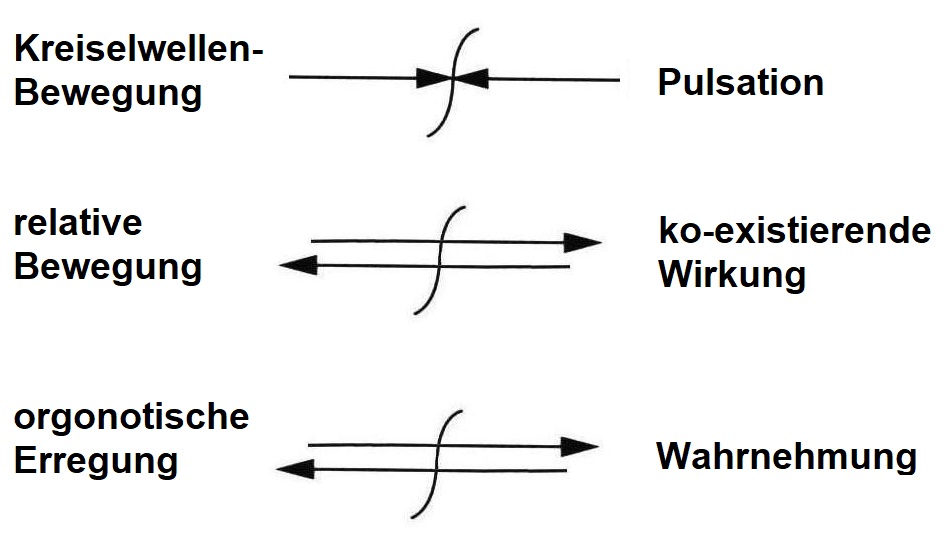 Ähnliches läßt sich über die Funktion „relative Bewegung“ (das gemeinsame Funktionsprinzip von Pulsation und Kreiselwelle) und die Funktion „ko-existierende Wirkung“ sagen. Die Bewegung verankert uns in der Realität, während beispielsweise unser Traumerleben vollkommen von den Gesetzen von Raum und Zeit befreit zu sein scheint: ko-existierende Wirkung. Wie Freud in der Neuen Folge zur Einführung in die Psychoanalyse schreibt: „Es gibt im Es nichts, was man der Negation gleichstellen könnte, auch nimmt man mit Überraschung die Ausnahme von dem Satz der Philosophen wahr, daß Raum und Zeit notwendige Formen unserer seelischen Akte seien“ (Studienausgabe, Bd. 1, S. 511).