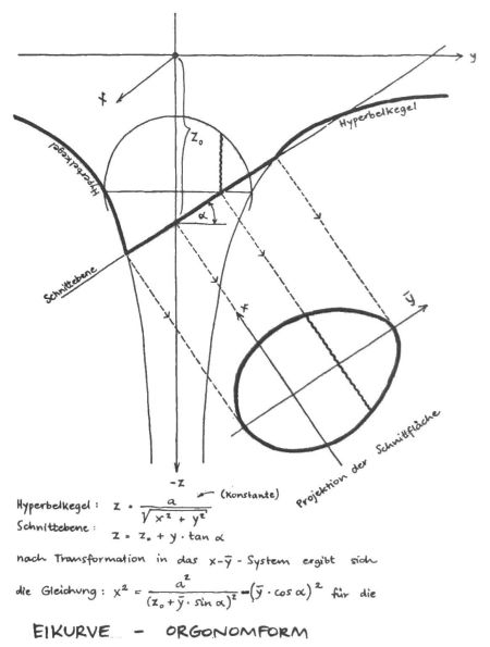 Im Anschluß an diese Ausführungen über grundsätzliche Formen macht Reich noch mehr oder weniger hypothetische Aussagen über makroskopische Vorgänge wie zB die Entstehung von Wirbelstürmen und sogar die Bildung von galaktischen Strukturen. Deswegen erscheint es mir interessant, auf Querverbindungen zu den Theorien einer anderen Gruppe wissenschaftlicher Außenseiter hinzuweisen, die auf den Erkenntnissen des 1958 verstorbenen Viktor Schauberger aufbauen. In diesen Theorien nimmt die Funktion der einrollenden Spiralbewegung (Wirbel) eine zentrale Stellung ein. Obwohl zwischen der Theorie Schaubergers und der physikalischen Orgonomie noch eine Reihe gut miteinander verträglicher Aussagen bestehen, soll darauf an dieser Stelle nicht weiter eingegangen werden. Eine ausführliche Darstellung ist für eine spätere Ausgabe der WRB vorgesehen. Für unsere gegenwärtigen Betrachtungen interessant ist vor allem die in den Heften V/2 und VI/1-4 der Zeitschrift Kosmische Evolution der Schauberger-Gruppe veröffentlichte formelmäßige Erfassung der Eiform, die ich bisher noch in keinem Mathematikbuch fand, sowie deren geometrische Ableitung aus der Form des (Wirbel-) Trichters. Die von Reich so genannte Raumkurve der Kreiselwelle wiederum wird ebenfalls an diesem Trichter dargestellt, und zwar als Projektion der ebenen harmonikalen Spirale auf dessen Mantelfläche.