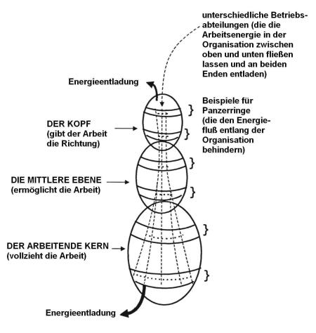 Die von Reich in Charakteranalyse beschriebenen sieben biophysischen Segmente des Menschen finden eine Entsprechung in den drei Grundstrukturen einer Organisation: der „Kopf“, der der Arbeit Richtung verleiht; die mittlere Ebene, die alles für die tatsächliche Arbeit bereitstellt und organisiert; und der arbeitende Kern, der die Arbeitsleistung vollführt. Dies entspricht dem leitenden Management, dem mittleren Management und der Arbeitsebene. Aufgabe des ersten Segments ist die fundamentale Ausrichtung der Arbeit, des zweiten die Organisierung des Arbeitsflusses und des dritten die Entladung der Arbeit durch Wechselwirkung mit der Umwelt.