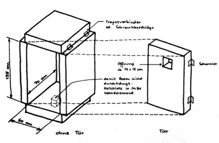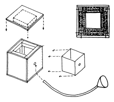 um das [oben dargestellte] Gerüst herum Dämmplatten nageln; Schichten einlegen; oben offenen Blechkasten hineinstellen