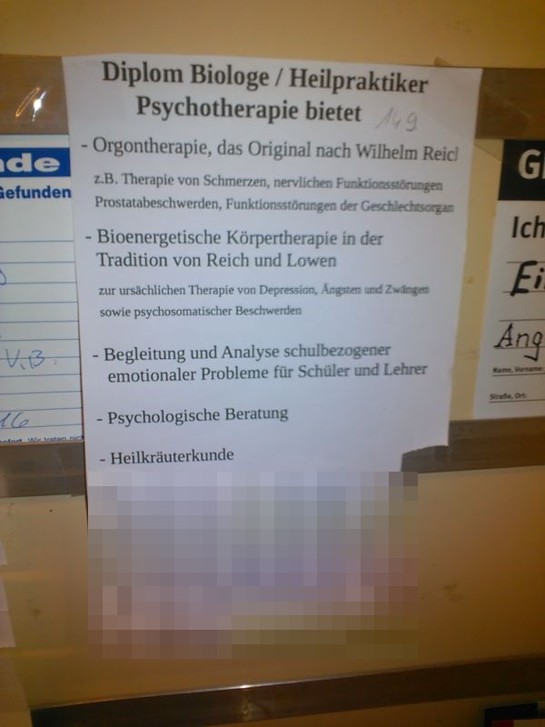Würden Sie an Ihrem Auto das Getriebe und die Bremsen statt von einem KFZ-Meister, lieber von einem Diplompolitologen, einem ehemaligen Kindergärtner oder einem Schlossermeister richten und reparieren lassen? Warum gehen sie dann, wenn sie emotionale („psychische“) Probleme haben, zu irgendwelchen „Reichianischen Therapeuten“ oder angeblichen „Orgontherapeuten“, deren Qualifikation meist nur darin besteht, irgendwann mal selbst Patient eines „Reichianischen Therapeuten“ oder eines Orgontherapeuten gewesen zu sein? Offenbar gehen Sie mit Ihrem Auto vorsichtiger und pfleglicher um als mit Ihrem eigenen Organismus!