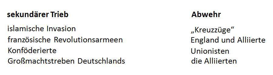 Im Leben des Einzelnen und in der Geschichte der Völker ereignet sich nichts „einfach so“. Genauso wie im neurotischen Individuum alle Strebungen jeweils Impuls und Gegenimpuls (Abwehr) entsprechen, kann man auch gesellschaftliche Ereignisse, insbesondere aber Kriege, einordnen. Stets entspricht die eine Kriegspartei dem Durchbruch von Trieben und die andere dem Versuch, diese Triebe in Schach zu halten. „Materielle“ Interessenkonflikte spielen hierbei nur eine untergeordnete, vernachlässigbare Rolle. Jene Auseinandersetzungen, bei denen es geschichtlich tatsächlich nur um Ressourcen ging, entsprechen selbstredend nicht dem erwähnten neurotischen Kräftespiel und gehören deshalb nicht in diese Ausführungen. (Keine Angst, in späteren Teilen werde ich noch zu genüge auf die materiellen Interessen in den beiden Weltkriegen eingehen!)