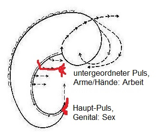 Der Puls ist mit dem Genital verbunden. Dies erinnert mich an das „Mahlen“ als zentrales Merkmal der von Robert Harman beschriebenen Puls-Funktion. Es ist funktionell identisch mit der Friktion während der genitalen Umarmung („Reiben“). Das „Vorwärtsschwingen“ ist zwiefach: Die „Kundalini-Bewegung“ die Wirbelsäule hinauf und natürlich der Orgasmus, begleitet vom gerichteten, strahlartigen Ausstoßen hochenergetischer Flüssigkeiten: