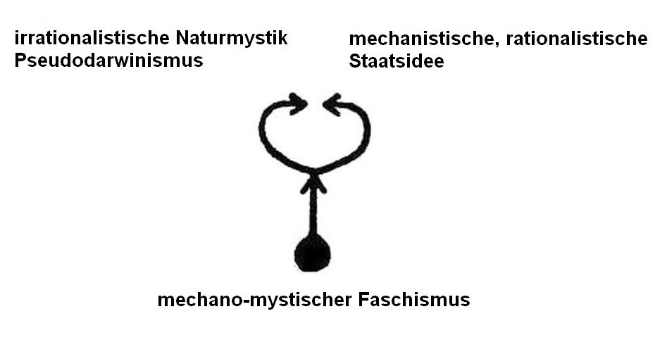 Von Anfang an, war für Reich „Faschismus“ aber weniger die terroristische Speerspitze des untergehenden und deshalb wild um sich schlagenden Kapitalismus, als vielmehr Ausfluß der mechanistischen und gleichzeitig mystischen Charakterstruktur der Menschen in der heutigen von Maschinen geprägten Massengesellschaft. Unterschiede zwischen den diversen Faschismen erklären sich aus diesem mechano-mystischen Grundwiderspruch. Bei Mussolini richtete sich alles auf die Durchsetzung einer totalitären Staatsidee, für die der Mystizismus (der Appell an den „Mythus“) nur Instrument war. Bei Hitler war es genau umgekehrt: der totalitäre Staat war ein bloßes Instrument zur Vernichtung des als „jüdischer Idee“ verachteten Staatsgedankens („David“) und dessen Ersetzung durch ein ständiges anarchisches Ringen um Macht, das stets dafür sorgt, daß das biologisch Starke sich durchsetzt („Goliath“). Eine verquere, sadistische Naturmystik.